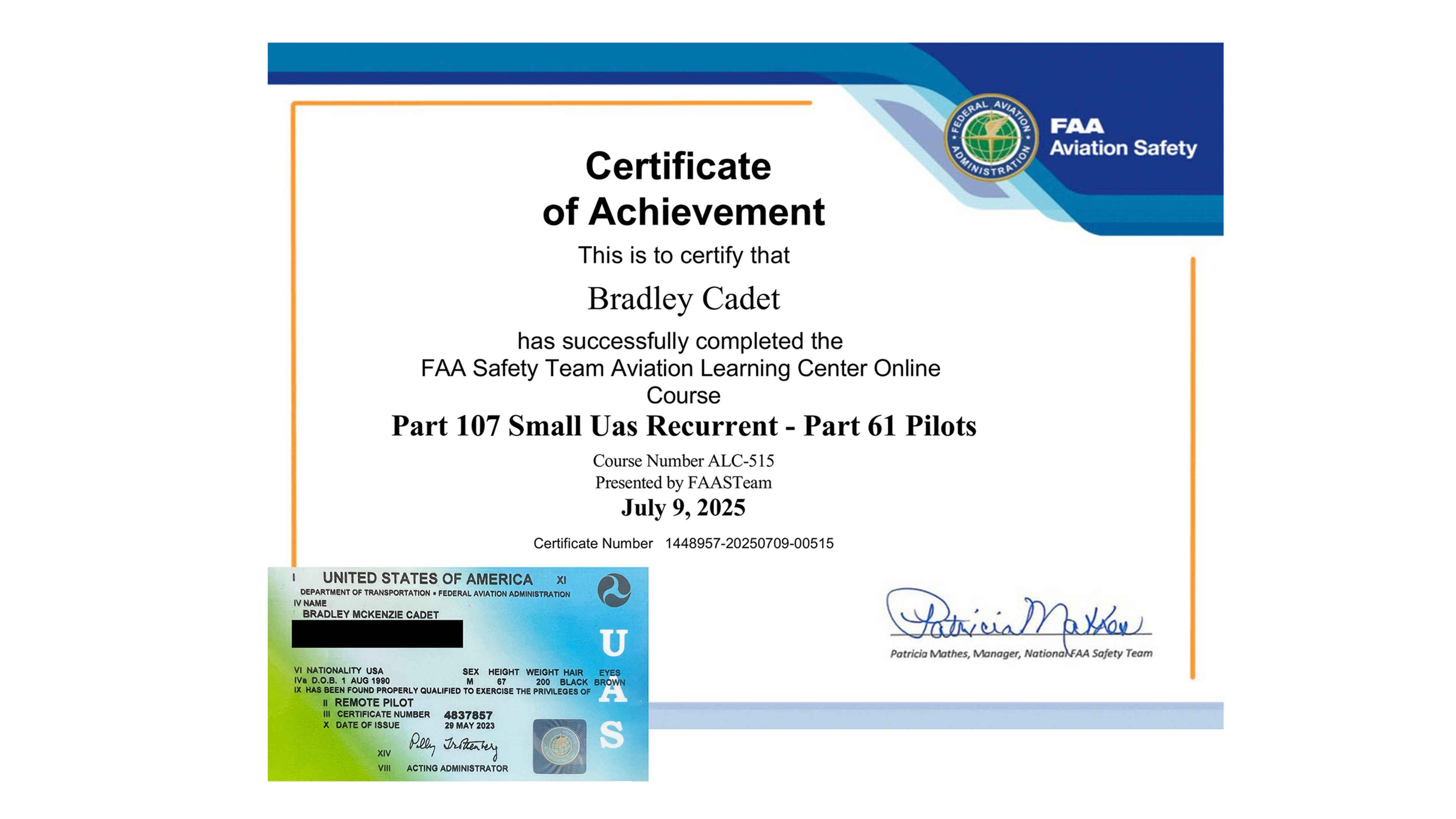 • FAA (Federal Aviation Administration) Part 107 Licensed + Insured